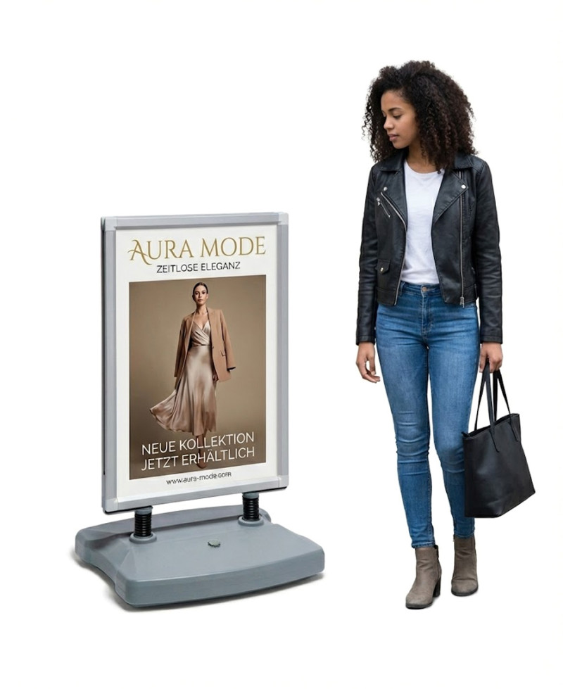 Mit dem Kundenstopper A1 mit Wassertank lassen sich Kommunikationsinhalte in Form von Drucken und Plakaten im DIN A1 Format präsentieren. Somit erhalten Sie eine Projektionsfläche von beiden Seiten, durch welche Ihre Botschaft ins Auge sticht und vom Kunden nicht übersehen wird. Die tolle Flexibilität der zwei integrierten Rahmen ermöglicht es Ihnen, das Plakat in den perfekten Winkel zu drehen, sodass es aus jeder Kundenperspektive anspricht und deutlich erkennbar ist.