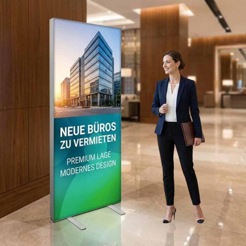 Doppelte Wirkung: Das Display ist beidseitig bedruckbar und sorgt somit für maximale Aufmerksamkeit aus jeder Richtung.
