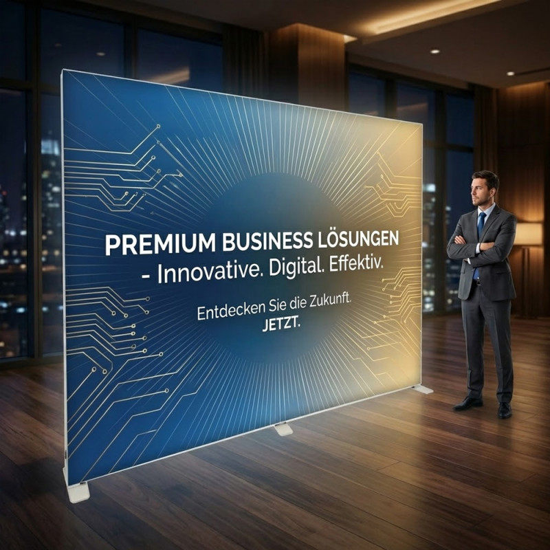 Setzen Sie Ihre Werbebotschaft eindrucksvoll in Szene – mit dem Textil-Leuchtrahmen XL. Mit einer beeindruckenden Größe von 3 x 2,4 Metern bietet diese Leuchtwand eine großzügige Werbefläche, die garantiert die Aufmerksamkeit auf sich zieht und im Gedächtnis bleibt.